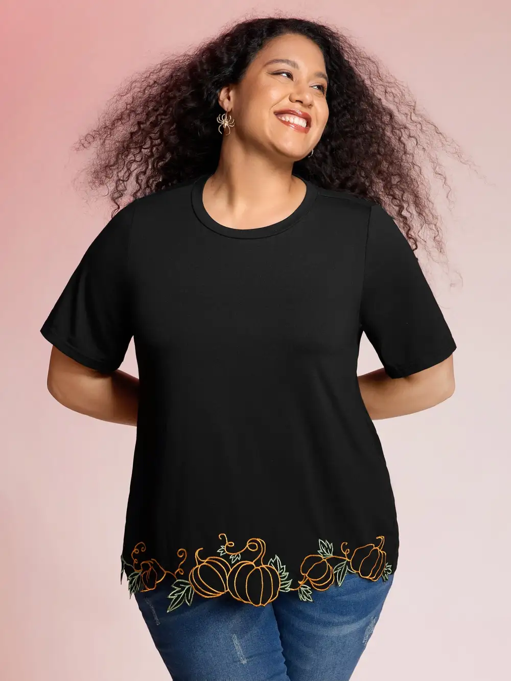 Shop Pumpkin Embroidered Hem Solid T-Shirt now and redefine your style with confidence at BloomChic. Tailored for mid and plus-size women. This trendy Tops Women, sizes 10-30. Color:Black;Prints:Non;Neckline:Round Neck;Sleeve Type:Regular Sleeve;Details:Embroidered, Asymmetrical;Pocket:No-pocket
