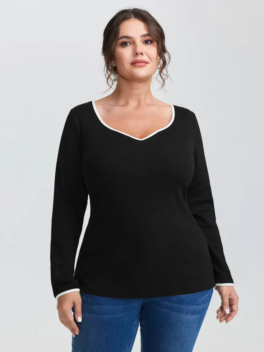 Shop Pure Cotton Ribbed Solid T-Shirt now and redefine your style with confidence at BloomChic. Tailored for mid and plus-size women. This trendy Tops Women, sizes 10-30. Color:Black;Prints:Non;Neckline:Heart neckline;Sleeve Type:Regular Sleeve;Details:Contrast;Pocket:No-pocket