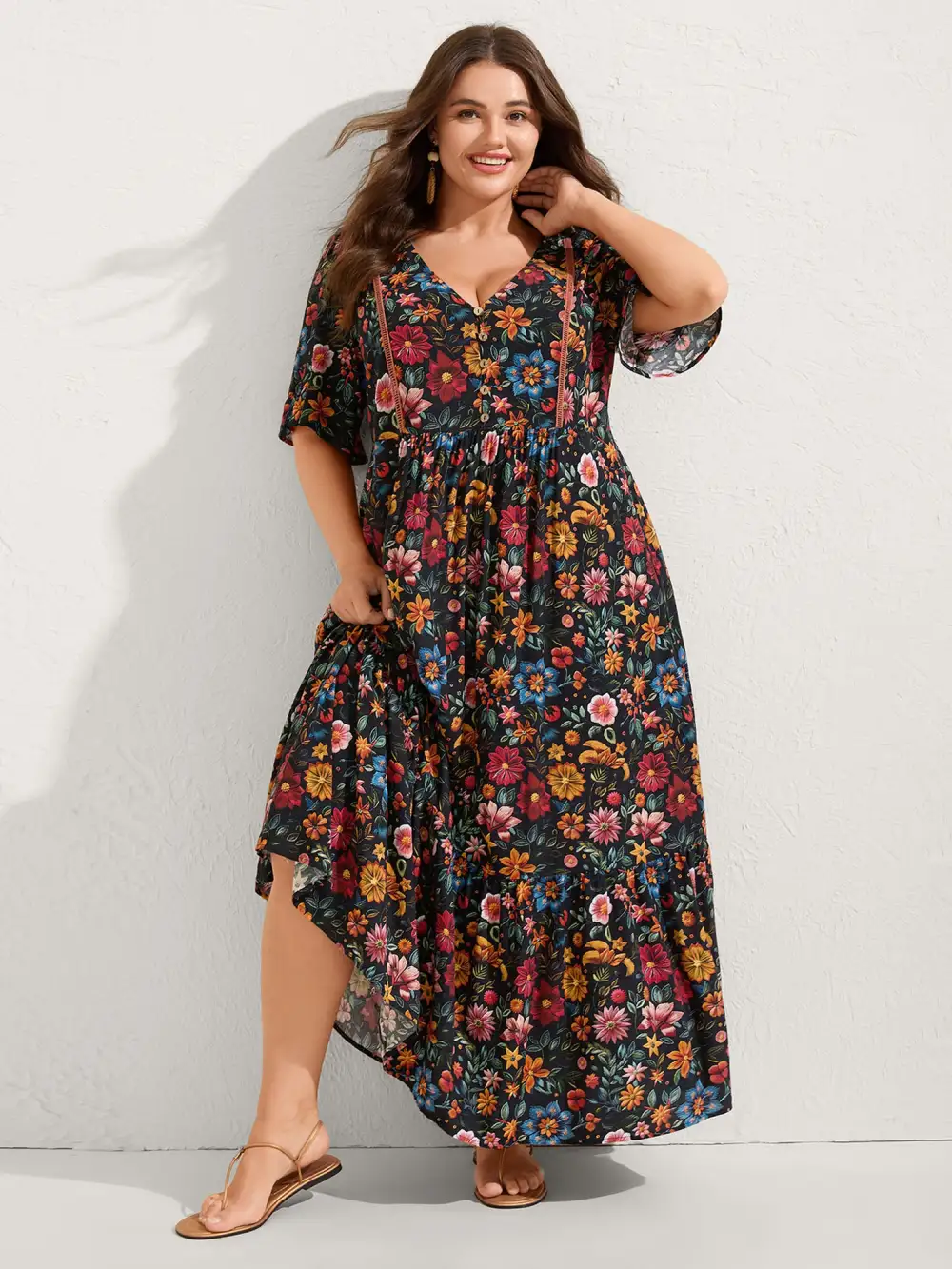 Shop Rayon Floral Lace Trim Button Maxi Dress now and redefine your style with confidence at BloomChic. Tailored for mid and plus-size women. This trendy Dress, sizes 10-30. You can never go wrong with BloomChic Dresses. Color:Black;Neckline:V-neck;Sleeve Type:Ruffle Sleeve;Prints:Floral;Pocket:Side seam pocket;Belt:No-belt;Closure Type:Non