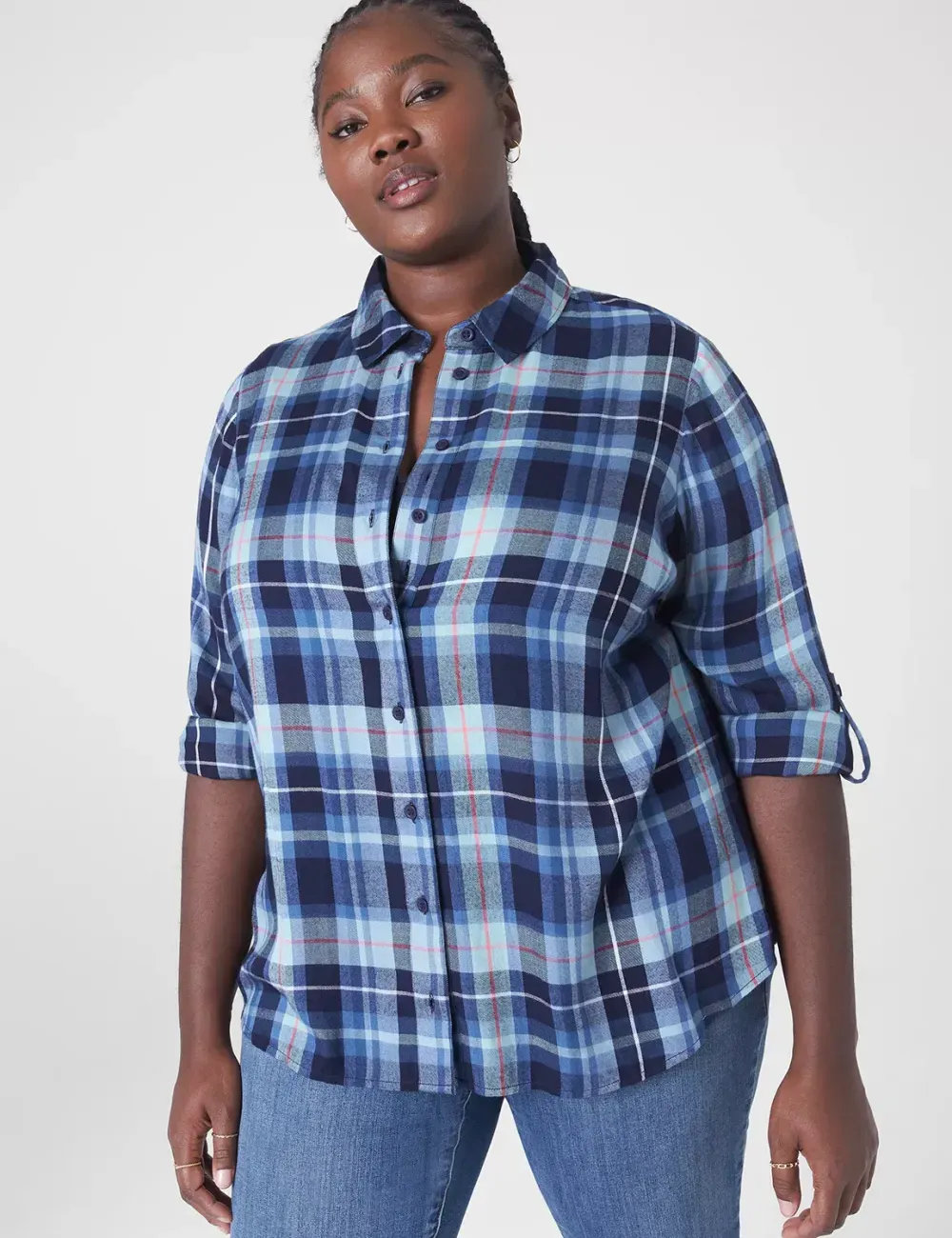 Classic collar. Long convertible roll-tab sleeves with single button cuffs. Button front. Bust darts provide shape and the perfect fit. Woven flannel fabric. Longer length is perfect for