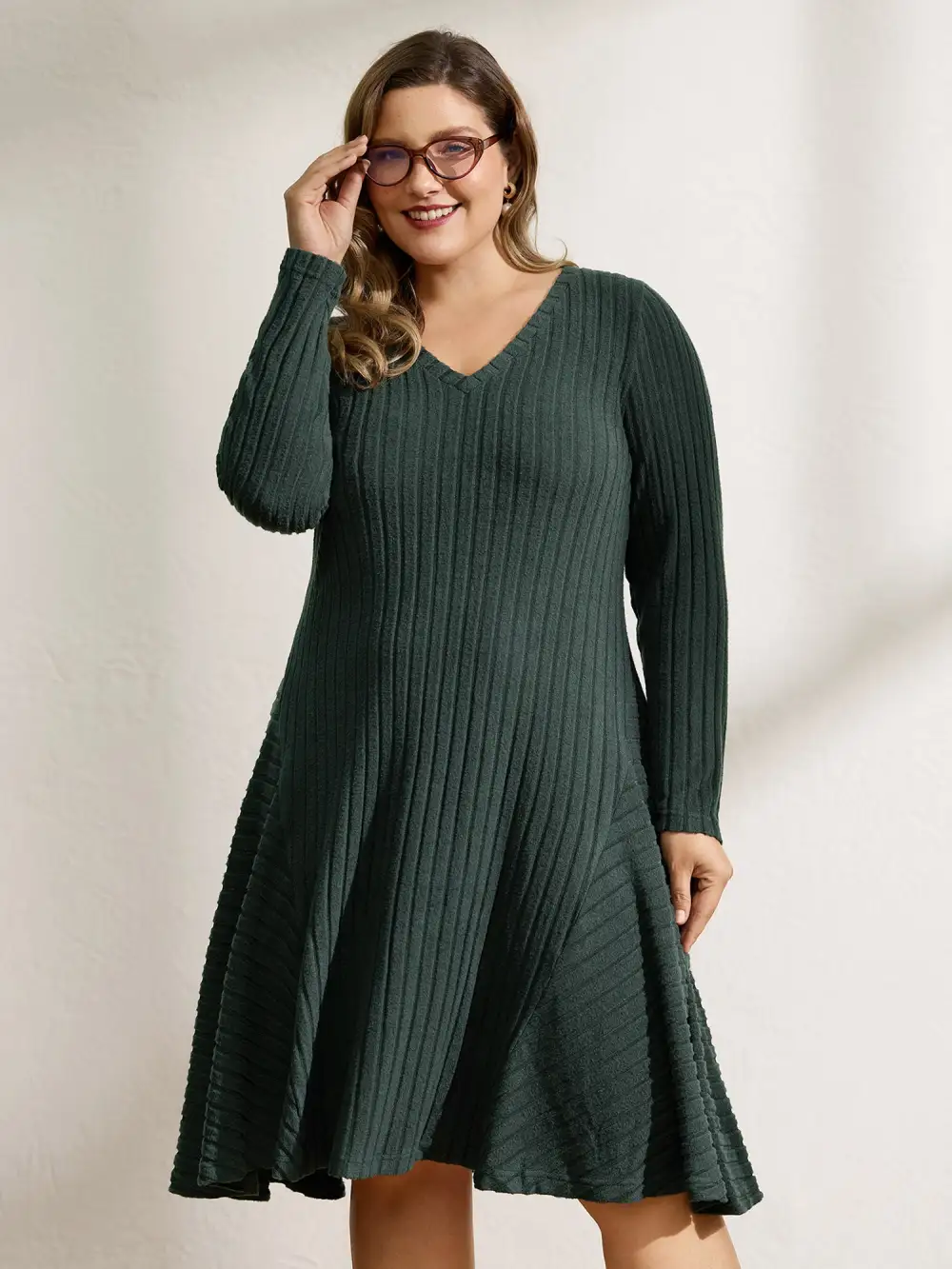Ribbed Fleece V-Neck Knit Midi Dress 10973305