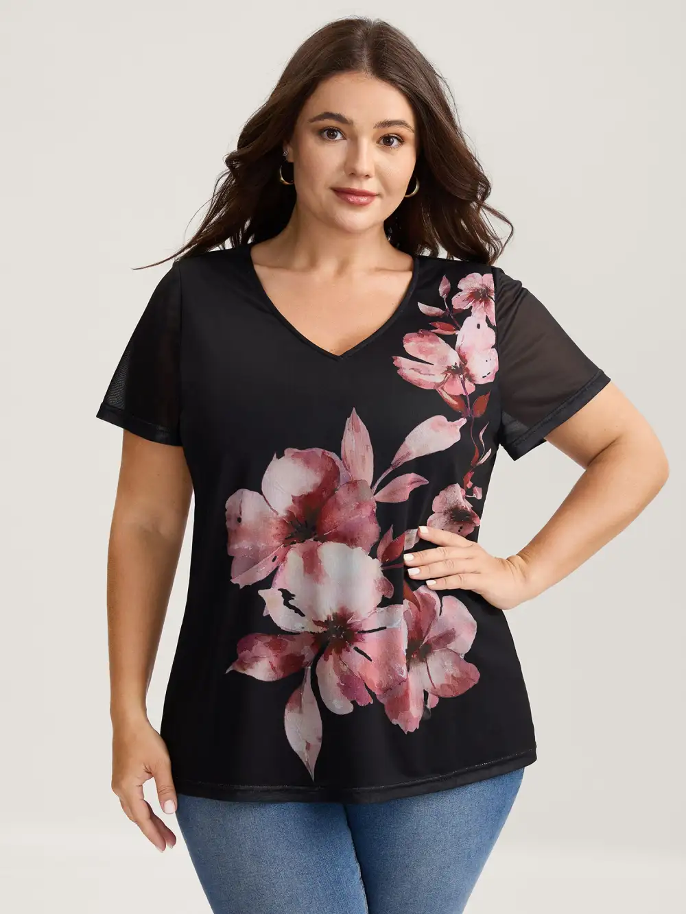 Shop Romantic Floral Motif Sheer Knit T-Shirt now and redefine your style with confidence at BloomChic. Tailored for mid and plus-size women. This trendy Tops Women, sizes 10-30. Color:Black;Pattern Type:Natural Flowers;Prints:Floral;Neckline:V-neck;Sleeve Type:Regular Sleeve;Details:Contrast;Pocket:No-pocket