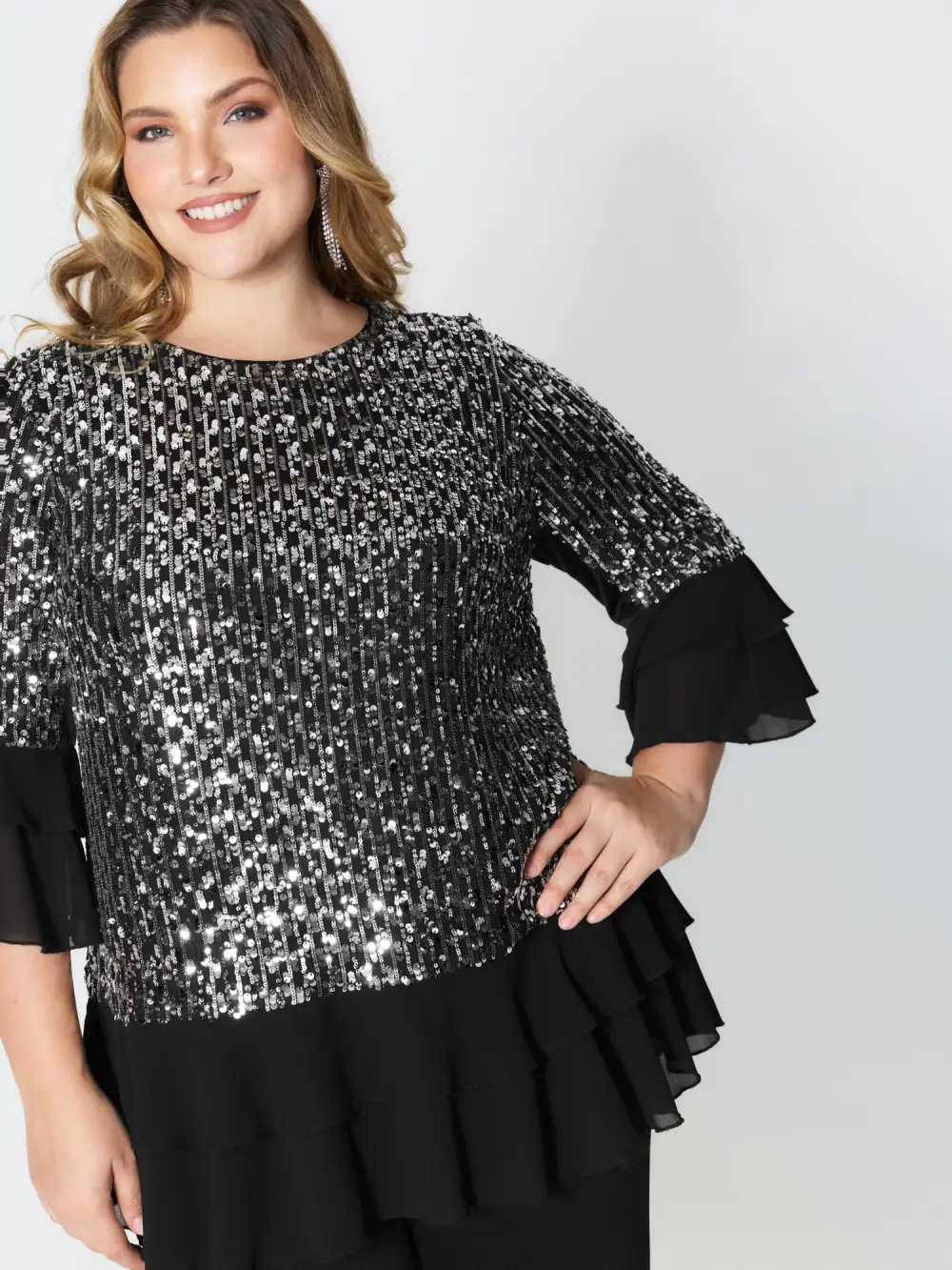 Shop Sequin Layered Ruffled Sleeve Blouse now and redefine your style with confidence at BloomChic. Tailored for mid and plus-size women. This trendy Tops Women, sizes 10-30. Color:Black;Prints:Non;Neckline:Round Neck;Sleeve Type:Ruffle Sleeve;Details:Contrast, Ruffles;Pocket:No-pocket