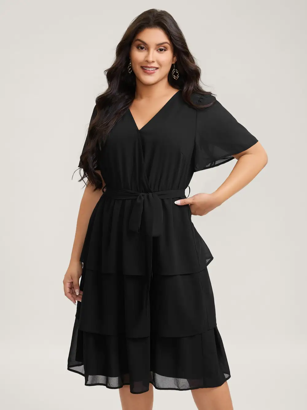 Shop Sheer Chiffon Layered Skirt Belted Midi Dress now and redefine your style with confidence at BloomChic. Tailored for mid and plus-size women. This trendy Dress, sizes 10-30. You can never go wrong with BloomChic Dresses. Color:Black;Neckline:Overlap Collar;Sleeve Type:Ruffle Sleeve;Prints:Non;Pocket:Side seam pocket;Belt:Belt;Closure Type:Non