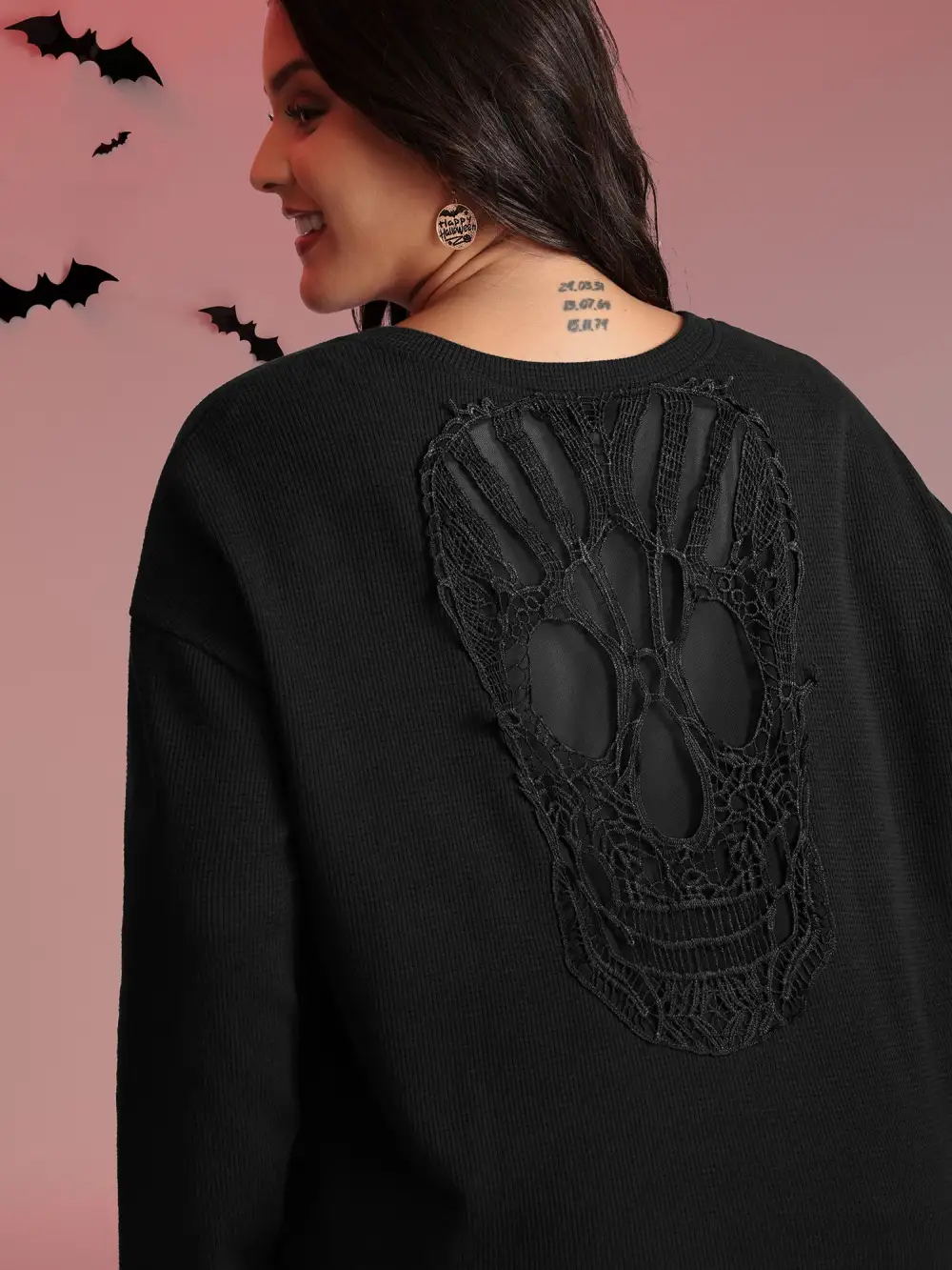 Shop Sheer Lace Back Textured Sweatshirt now and redefine your style with confidence at BloomChic. Tailored for mid and plus-size women. This trendy Tops Women, sizes 10-30. Color:Black;Neckline:V-neck;Sleeve Type:Regular cuff;Pattern Type:Halloween;Prints:Synthetic texture;Pocket:No-pocket;Belt:No-belt;Closure Type:Non
