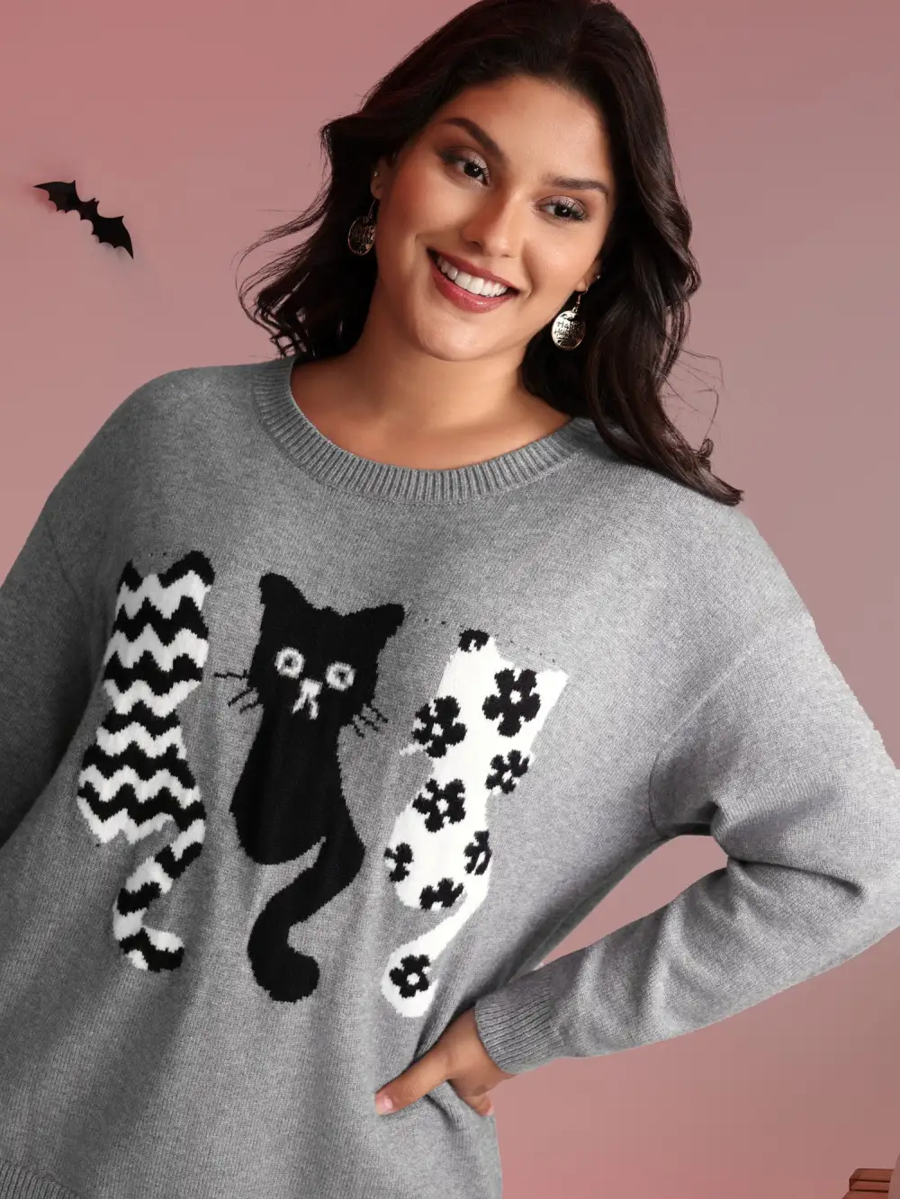 Shop Spooky Cats Jacquard Pattern Pullover now and redefine your style with confidence at BloomChic. Tailored for mid and plus-size women. This trendy Sweaters Cardigans Women, sizes 10-30. Color:DarkGray;Neckline:Round Neck;Sleeve Type:Drop shoulder sleeve;Pattern Type:Animals;Prints:Non;Pocket:No-pocket;Belt:No-belt;Closure Type:Non