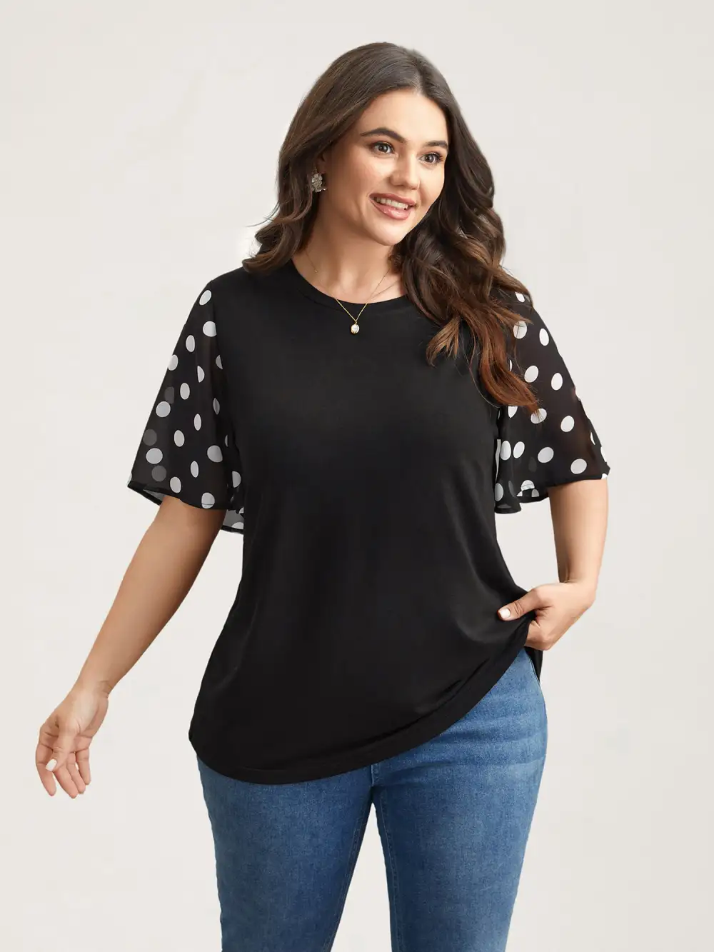 Shop Stretchy Sheer Dot Sleeve Textured T-Shirt now and redefine your style with confidence at BloomChic. Tailored for mid and plus-size women. This trendy Tops Women, sizes 10-30. Color:Black;Style:Elegant;Prints:Non;Neckline:Round Neck;Sleeve Type:Ruffle Sleeve;Details:Patchwork, Contrast, See through, Ruffles;Pocket:No-pocket