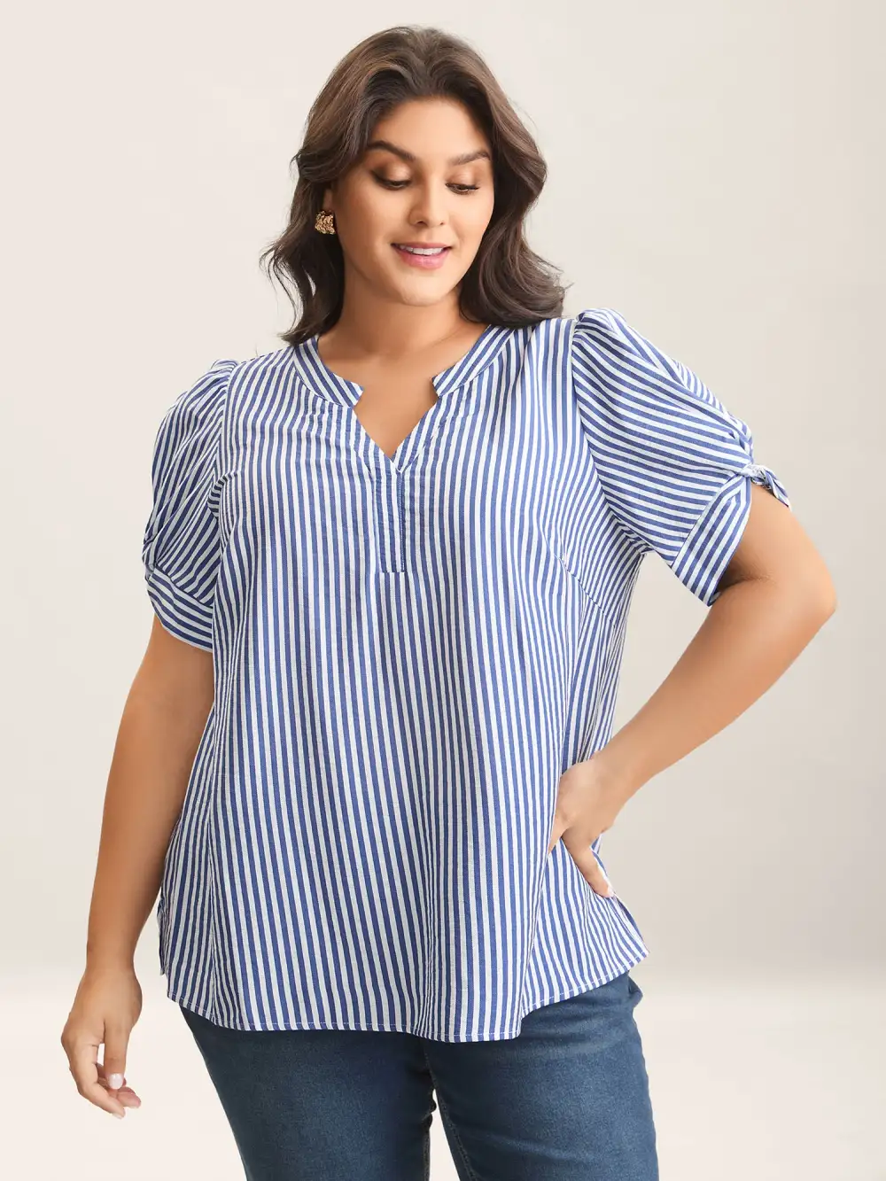 Shop Stripes Knotted Sleeve Notched Collar Blouse now and redefine your style with confidence at BloomChic. Tailored for mid and plus-size women. This trendy Tops Women, sizes 10-30. Color:DarkBlue;Prints:Stripes;Neckline:Notched collar;Sleeve Type:Lantern Sleeve;Details:Twist, Gathered, Slit;Pocket:No-pocket