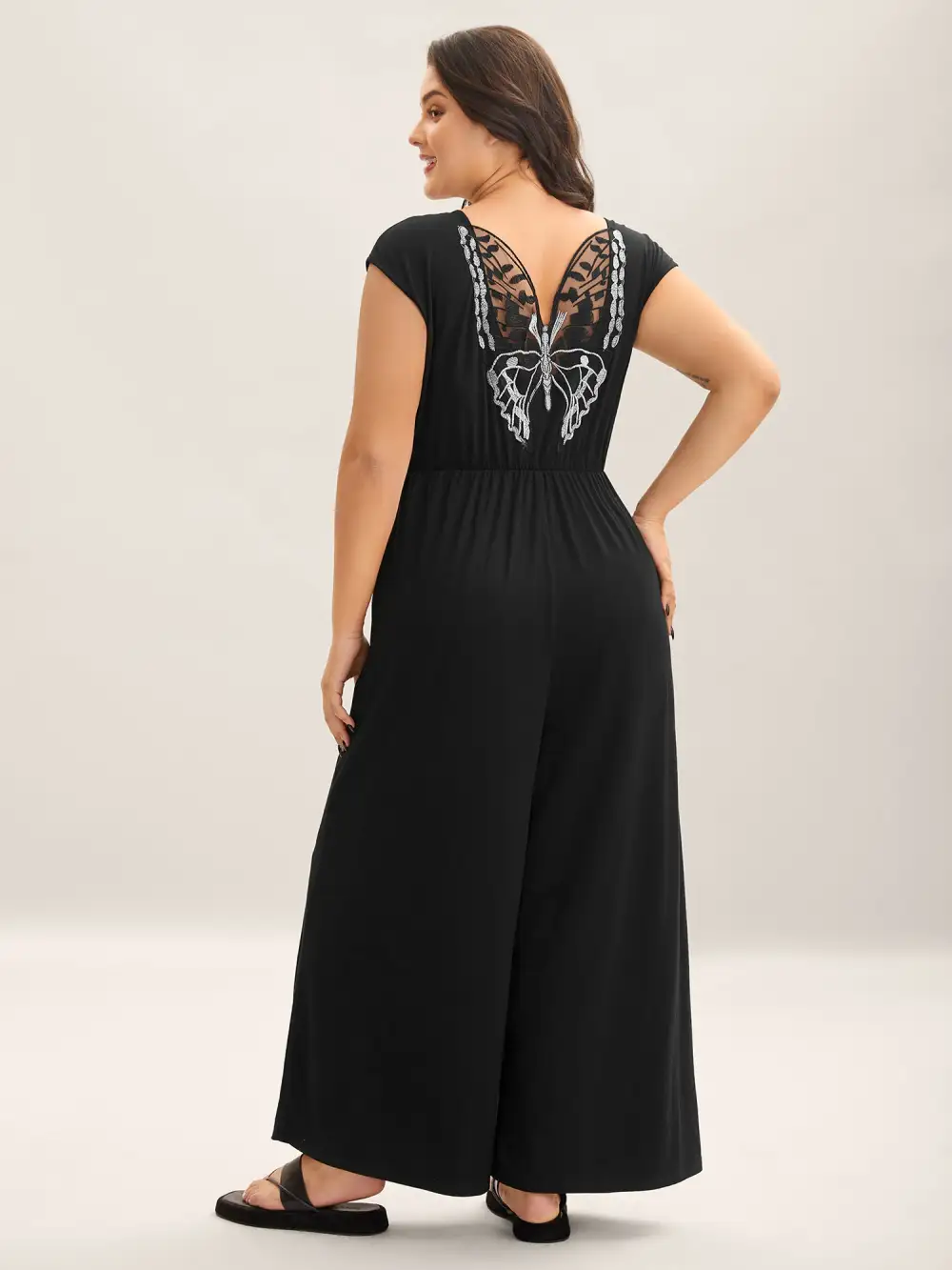 Shop Supersoft Butterfly Backless Stretchy Wide-Leg Jumpsuit now and redefine your style with confidence at BloomChic. Tailored for mid and plus-size women. This trendy Jumpsuits Women, sizes 10-30. Color:Black;Neckline:Overlap Collar;Sleeve Type:Cap sleeve;Prints:Non;Pocket:Side seam pocket;Belt:No-belt;Closure Type:Non