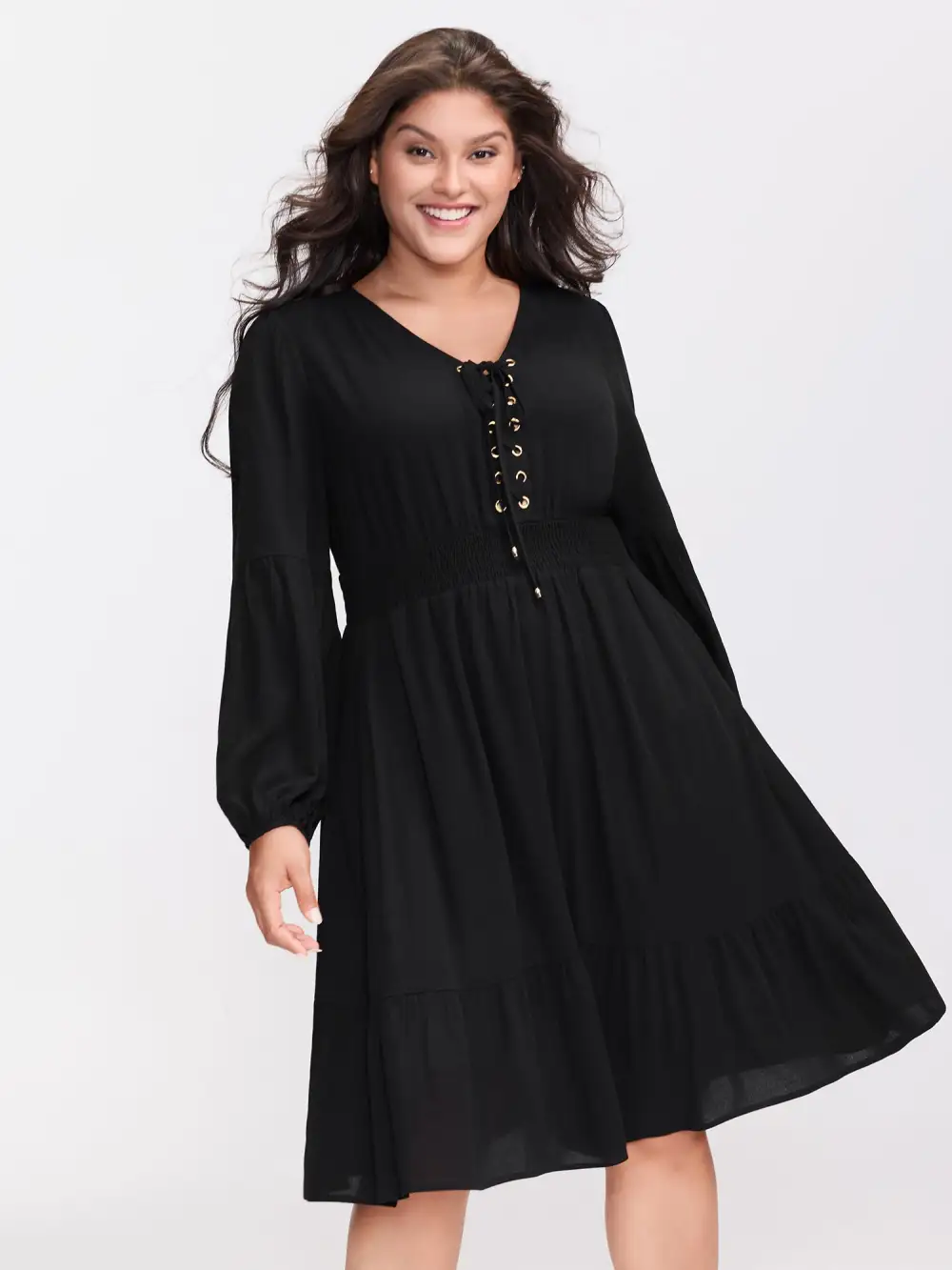 Shop Supersoft Drawstring Shirred Waist Midi Dress now and redefine your style with confidence at BloomChic. Tailored for mid and plus-size women. This trendy Dress, sizes 10-30. You can never go wrong with BloomChic Dresses. Color:Black;Neckline:V-neck;Sleeve Type:Lantern Sleeve;Prints:Non;Details:Eyelet, Cross straps, Shirred;Pocket:Side seam pocket;Belt:No-belt;Closure Type:Half-open front