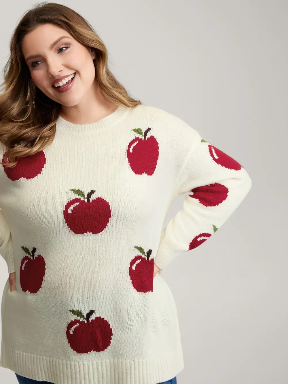 Shop Sweet Apple Print Jacquard Print Pullover now and redefine your style with confidence at BloomChic. Tailored for mid and plus-size women. This trendy Sweaters Cardigans Women, sizes 10-30. Color:Ivory;Neckline:Round Neck;Sleeve Type:Drop shoulder sleeve;Pattern Type:Fruit;Prints:Fruit and vegetable print;Pocket:No-pocket;Belt:No-belt;Closure Type:Non