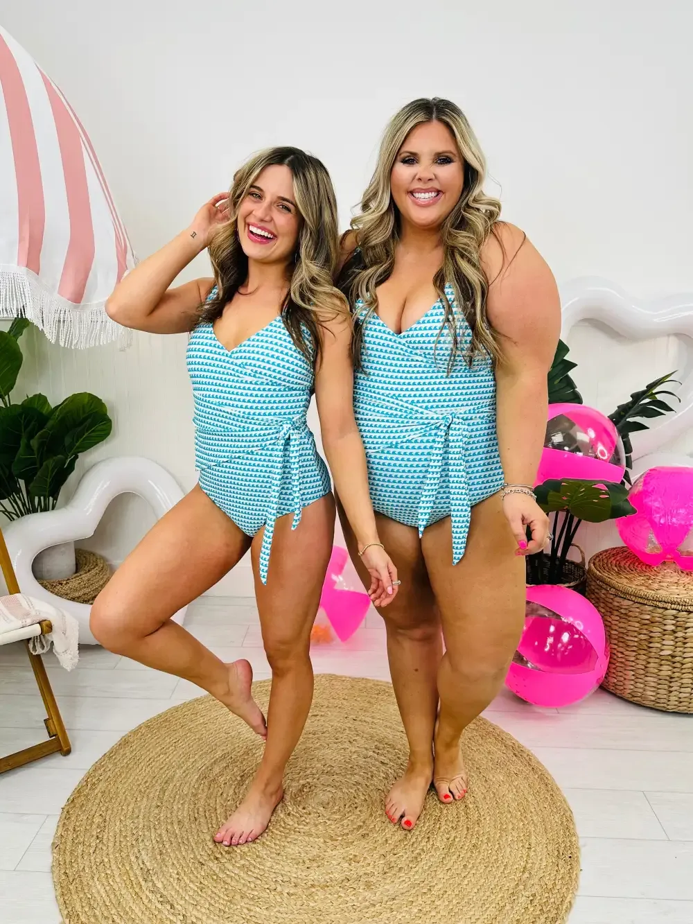 The fun wavy pattern and faux wrap design on this one piece will have you standing out on the beach. With a stylish tie front, built-in support, and surplice neckline, this swimsuit is both comfortable and chic. Plus, the thick straps provide extra support for a worry-free day at the beach.