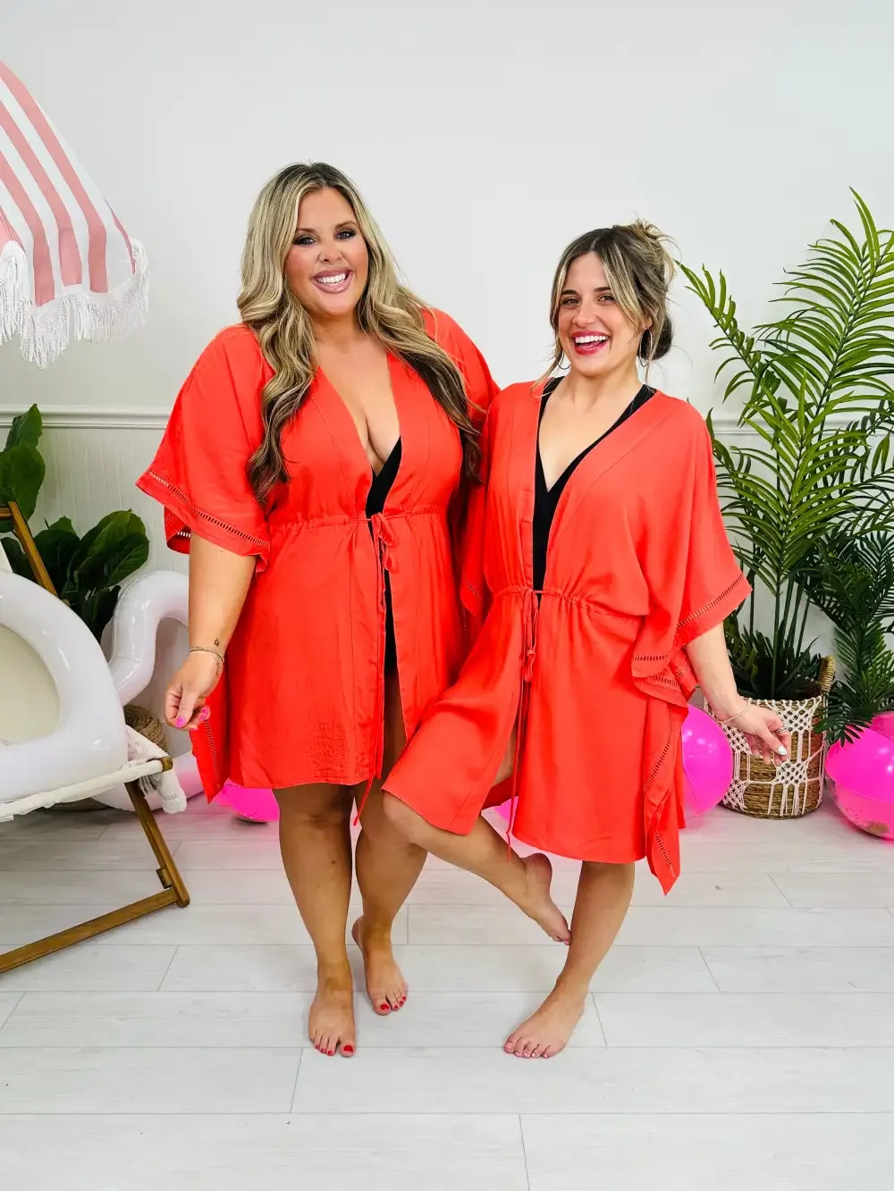 Featuring wide, flowy sleeves and delicate cutout detailing, this cover-up drapes beautifully for an airy, relaxed fit. The adjustable drawstring waist adds a flattering touch, making this the perfect blend of comfort and style for sunny days ahead!