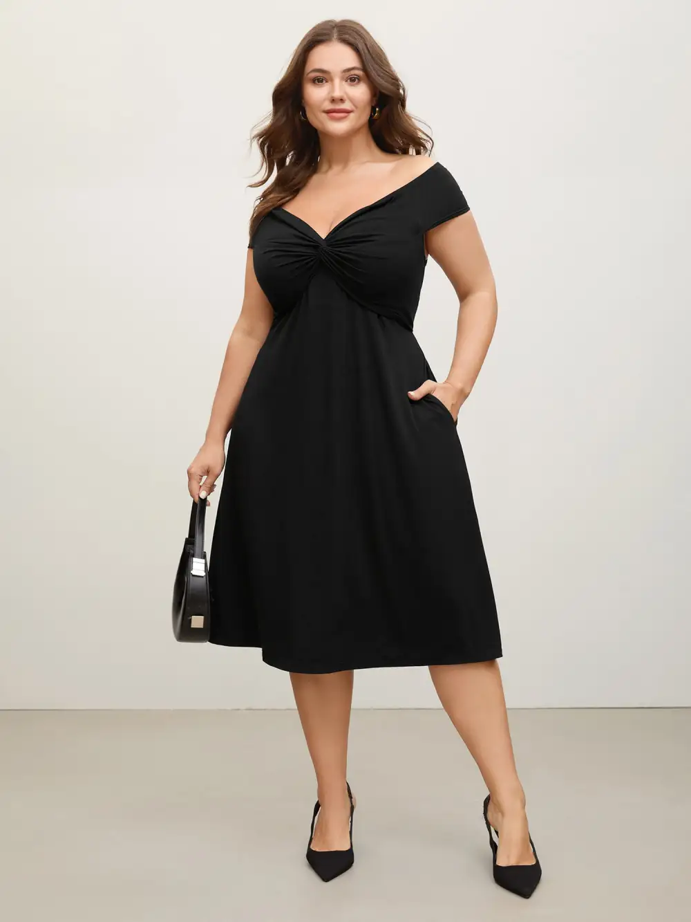 Shop Twist Front Off-Shoulder Pockets Midi Dress now and redefine your style with confidence at BloomChic. Tailored for mid and plus-size women. This trendy Dress, sizes 10-30. You can never go wrong with BloomChic Dresses. Color:Black;Neckline:One-shoulder neck;Sleeve Type:Cap sleeve;Prints:Geometric & color block;Pocket:Side seam pocket;Belt:No-belt;Closure Type:Non