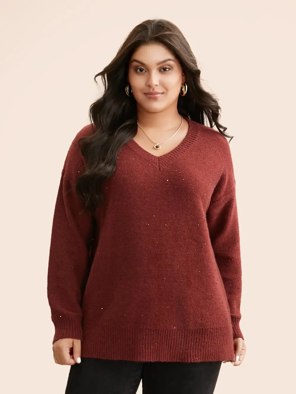 Shop V Neck Glitter Dropped Shoulder Split Hem Pullover now and redefine your style with confidence at BloomChic. Tailored for mid and plus-size women. This trendy Sweaters Cardigans Women, sizes 10-30. Season:Winter;Color:Deepred;Style:Casual;Neckline:V-neck;Sleeve Type:Drop shoulder sleeve;Prints:Non;Pocket:No-pocket;Belt:No-belt;Closure Type:Non