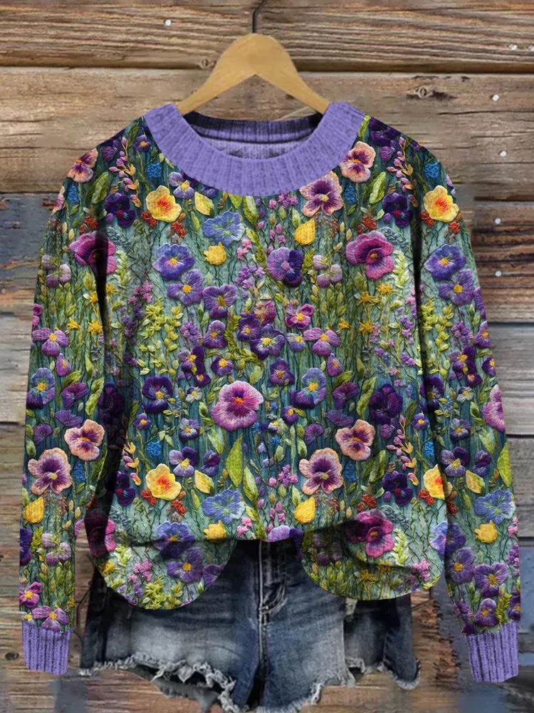 Violet Wildflower Embroidery Art Cozy Knit Sweater