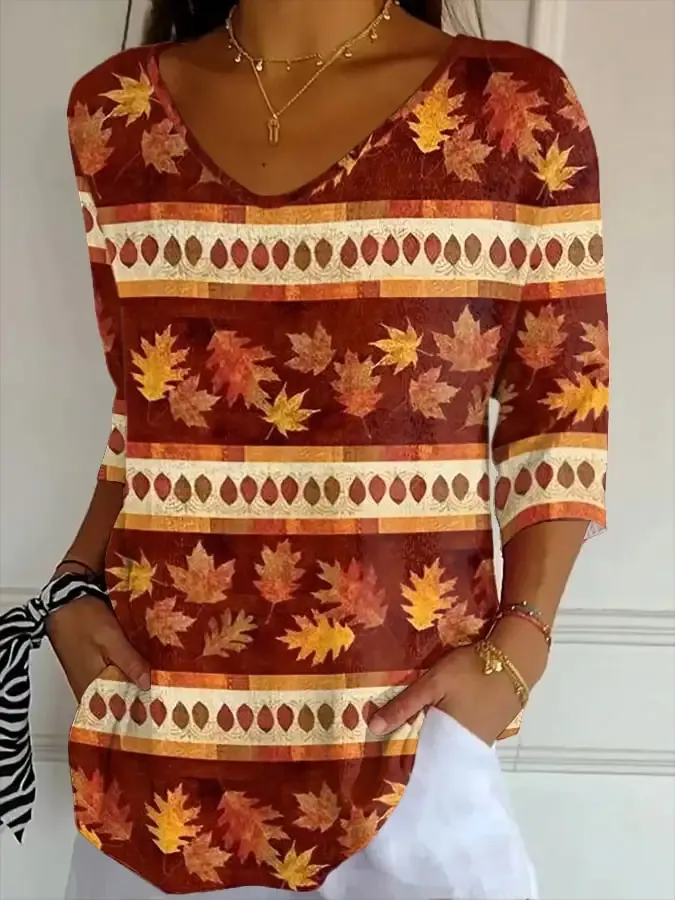 Women's Autumn Faith Maple Leaf Striped Fabric Casual V-neck Mid-sleeve T-shirt 10918247