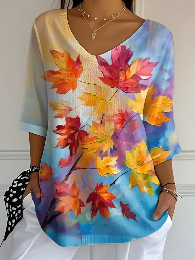 Women's Casual Autumn Maple Leaf Oil Painting Striped T-Shirt