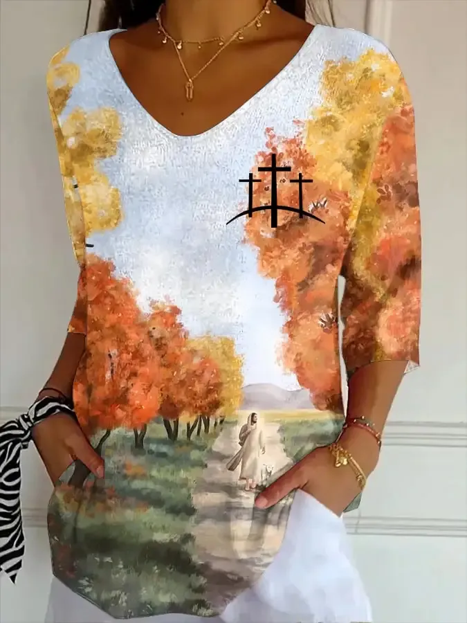 Women's Fall Faith Design Printed Striped Fabric Casual V-Neck Mid-Sleeve T-Shirt 10918575