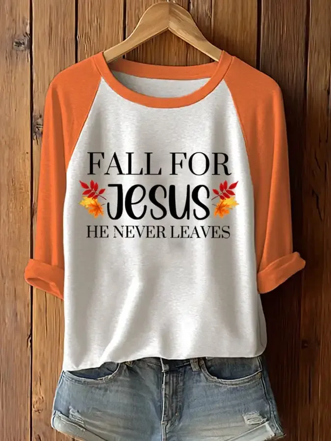 Women's Fall For Jesus He Never Leaves Print T-Shirt 10918151