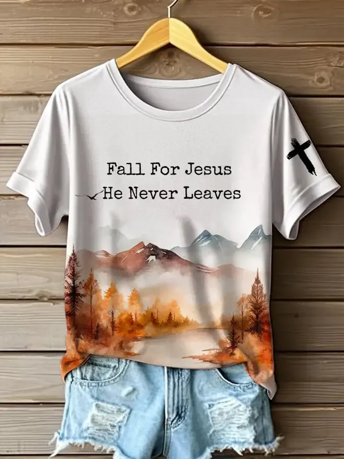 Women's Fall For Jesus He Never Leaves Print T-Shirt