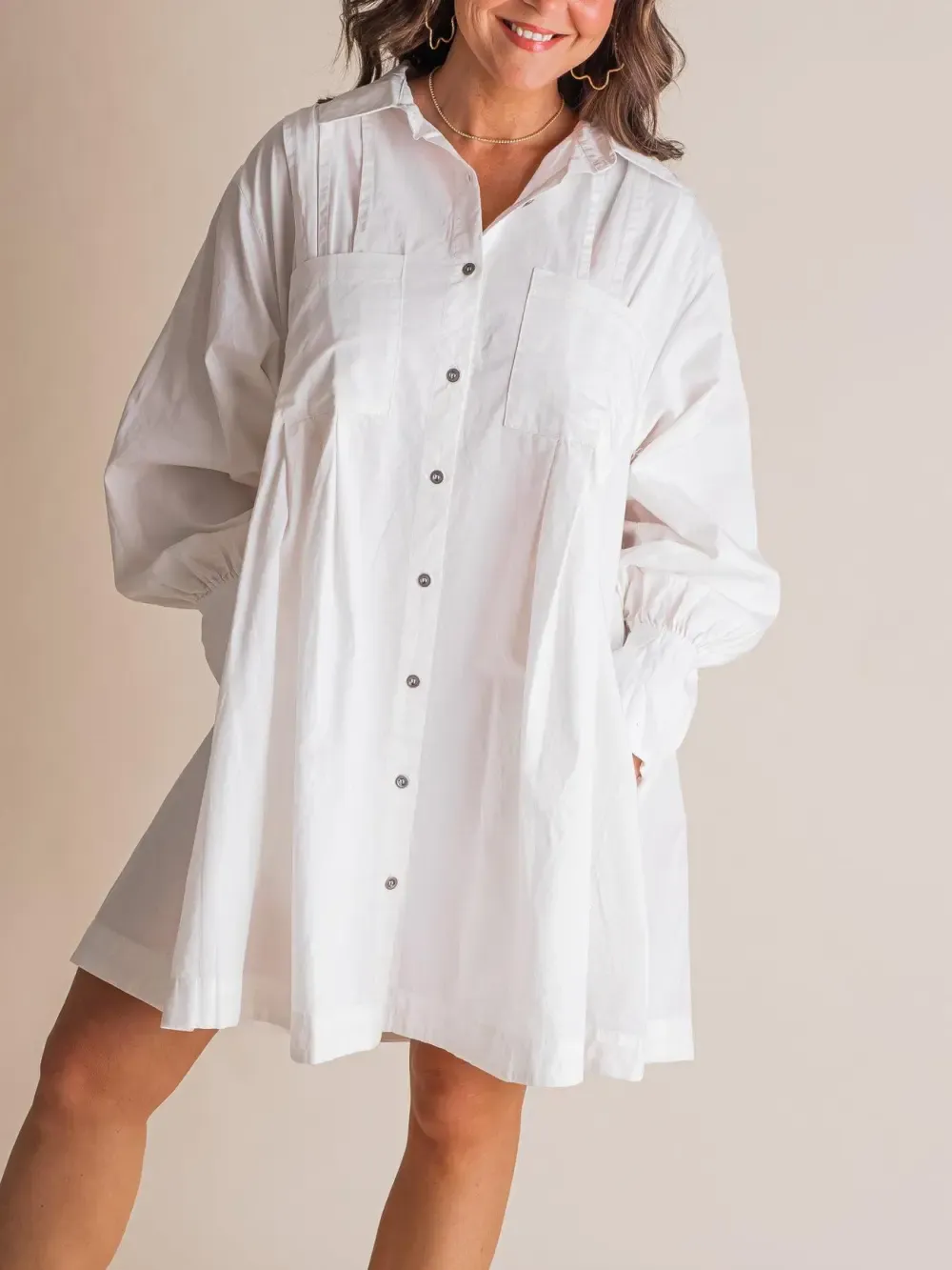A pleated shirt dress for any occasion! With a collar, button-front closure, front pockets and a loose fit, this dress is both stylish and practical. Wear it alone for a chic look or layer it up for a more cozy ensemble.